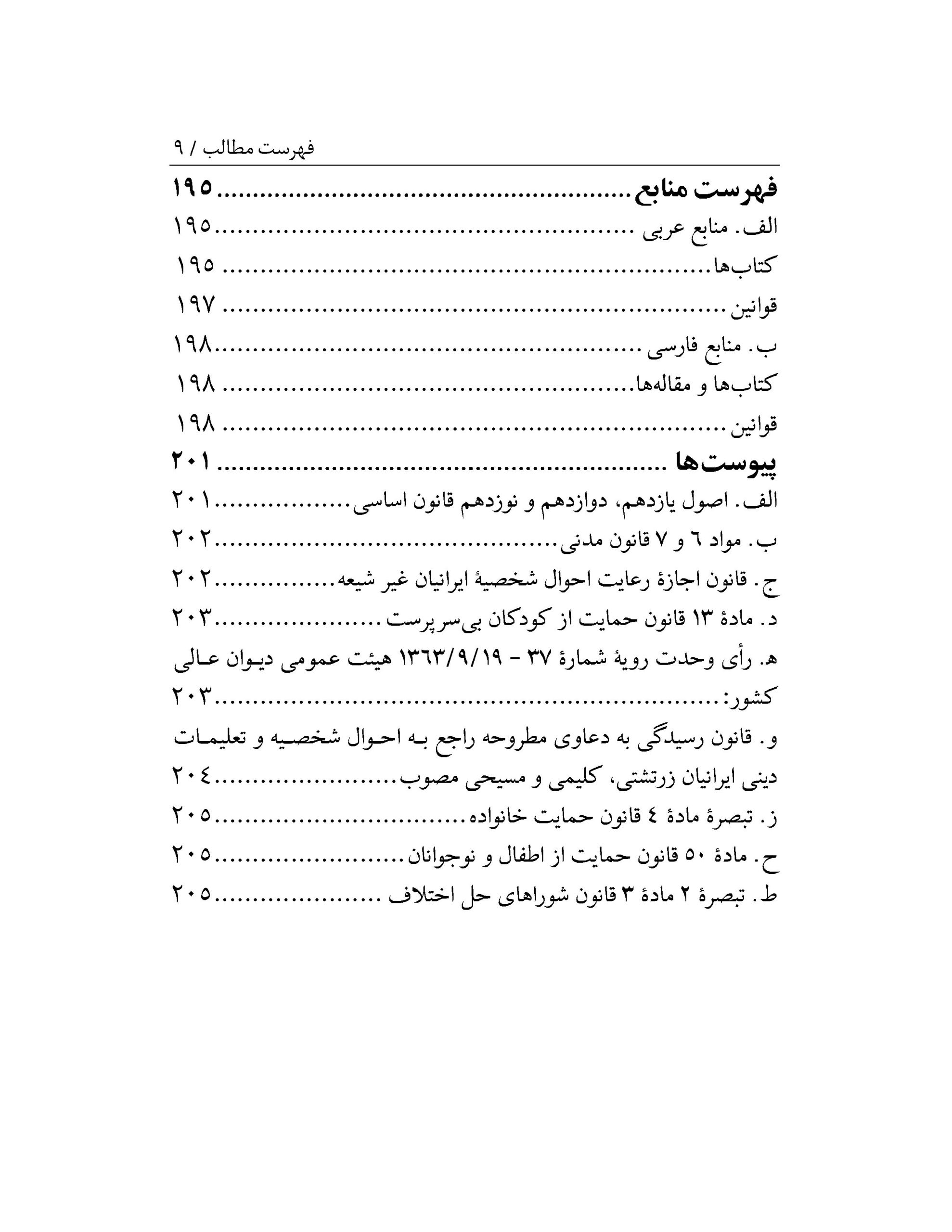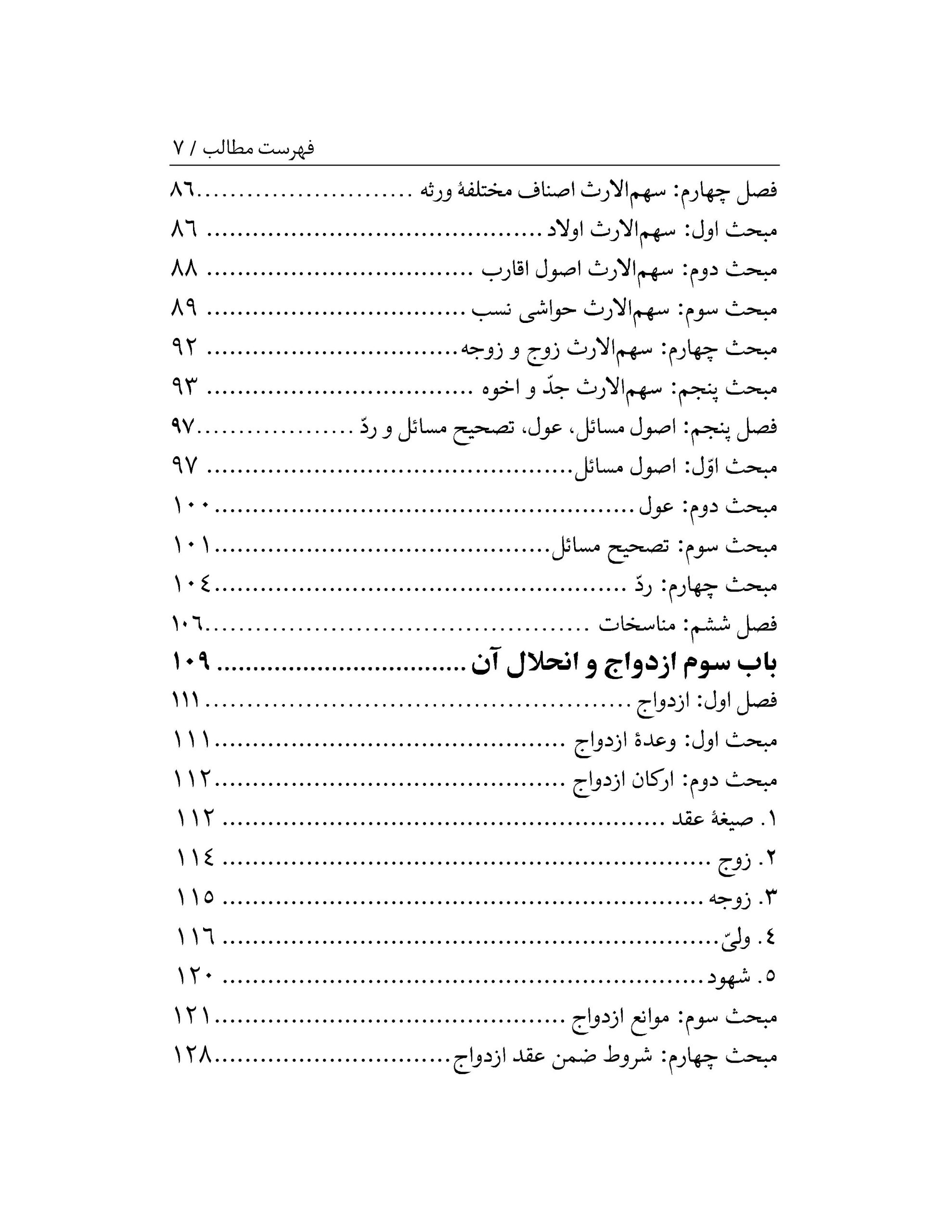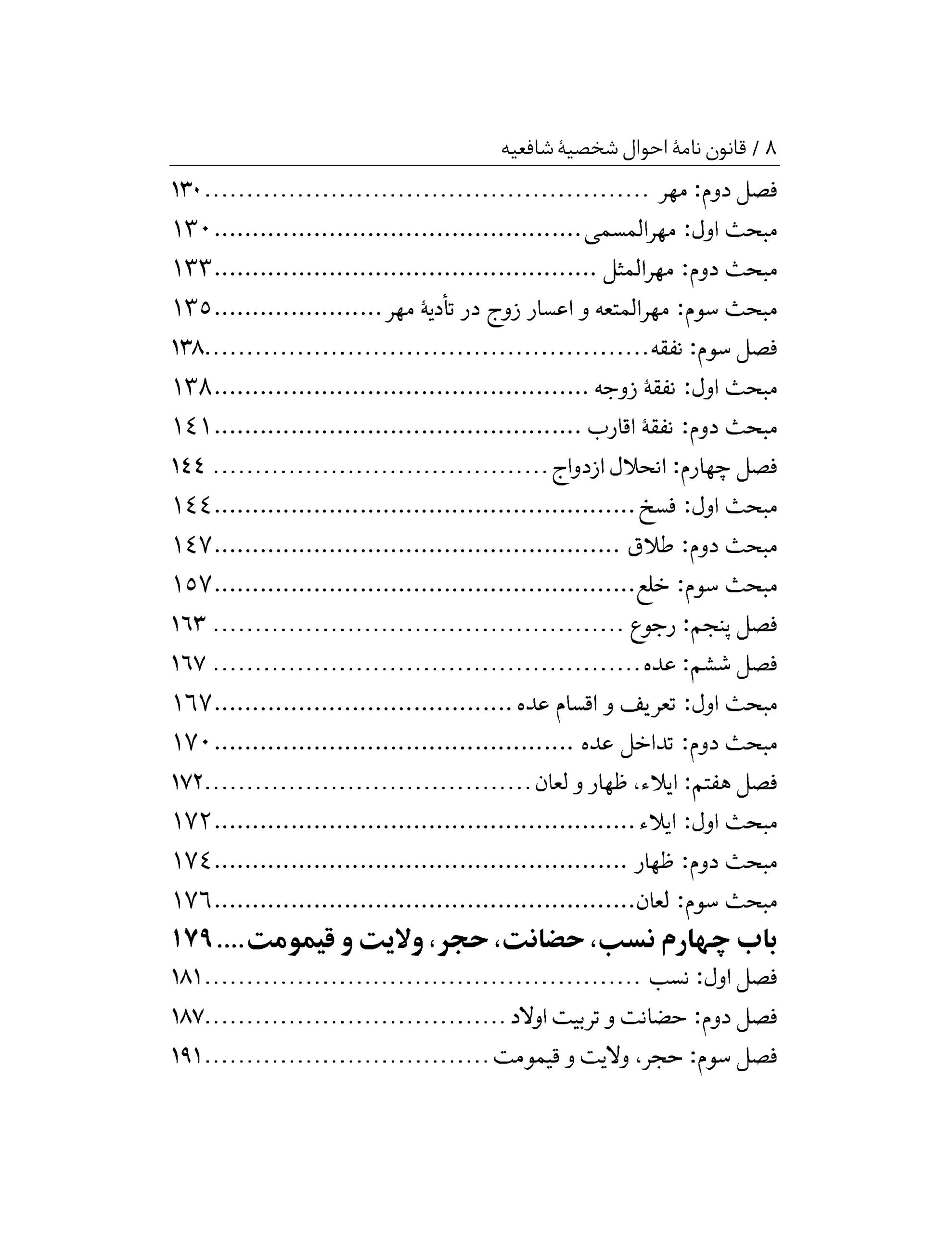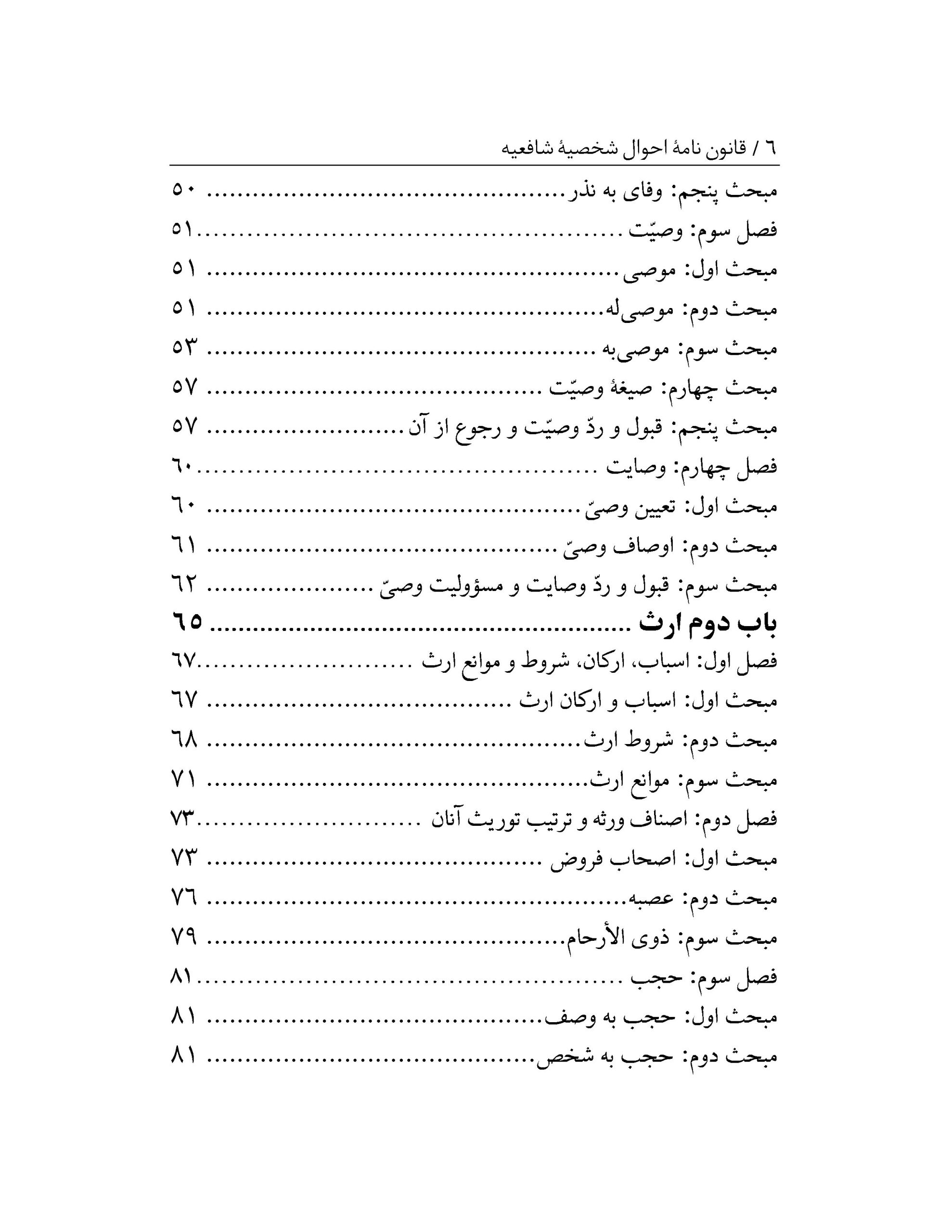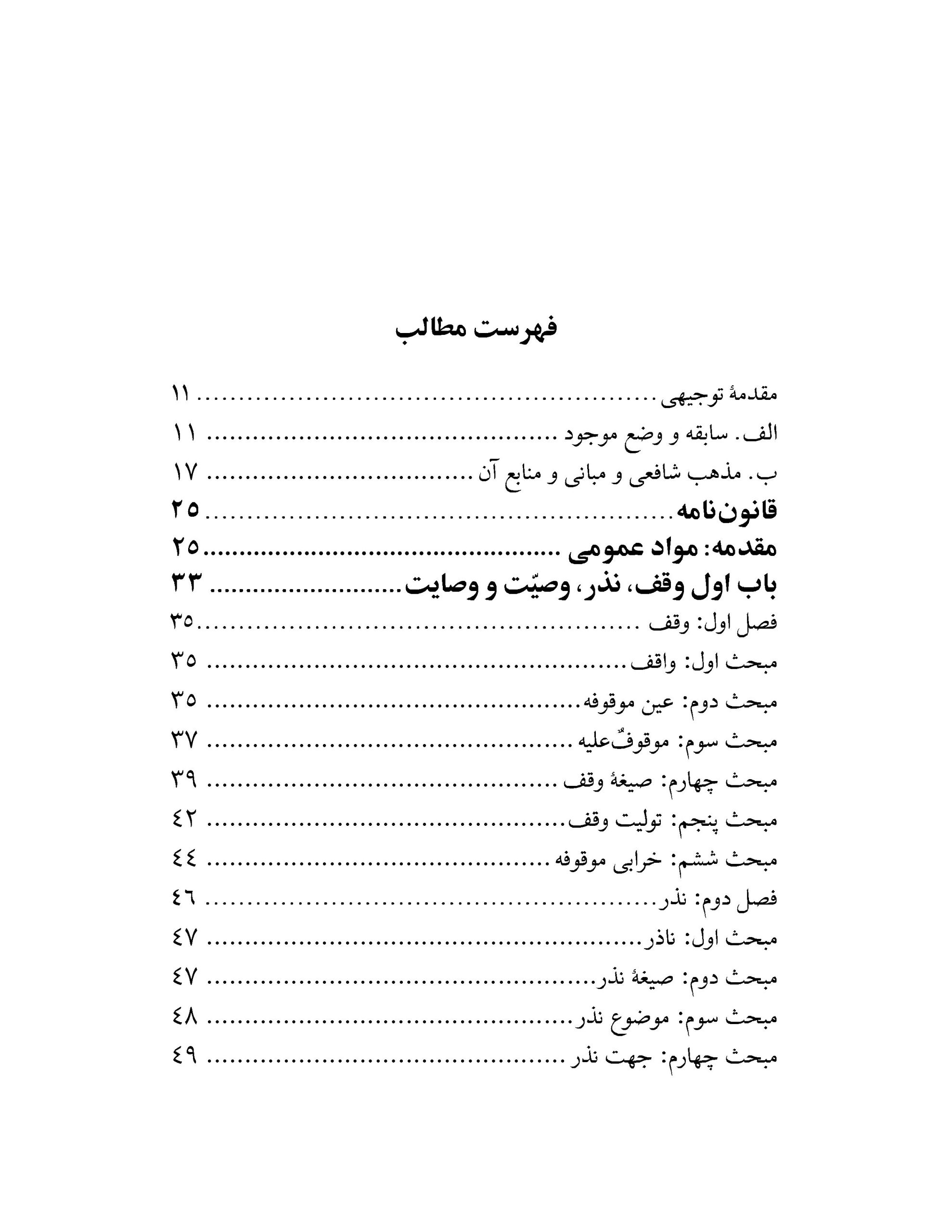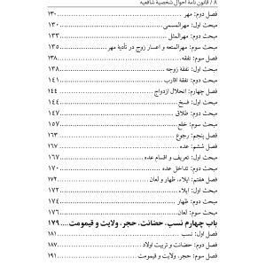 متن حاضر که در قالب طرح پژوهشی تدوین شده است مشتمل بر یک مقدمه و چهار باب است و مجموعاً ۷۵۵ ماده و ۷۲ تبصره را پدید آوردهاند. مقدمه شامل مواد عمومی، باب اول ناظر به وقف، نذر، وصیت و وصایت، باب دوم راجع به ارث یا فرائض، باب سوم شامل ازدواج و انحلال آن و باب چهارم مشتمل بر مسائل نسب، حضانت، حجر و قیمومت است.